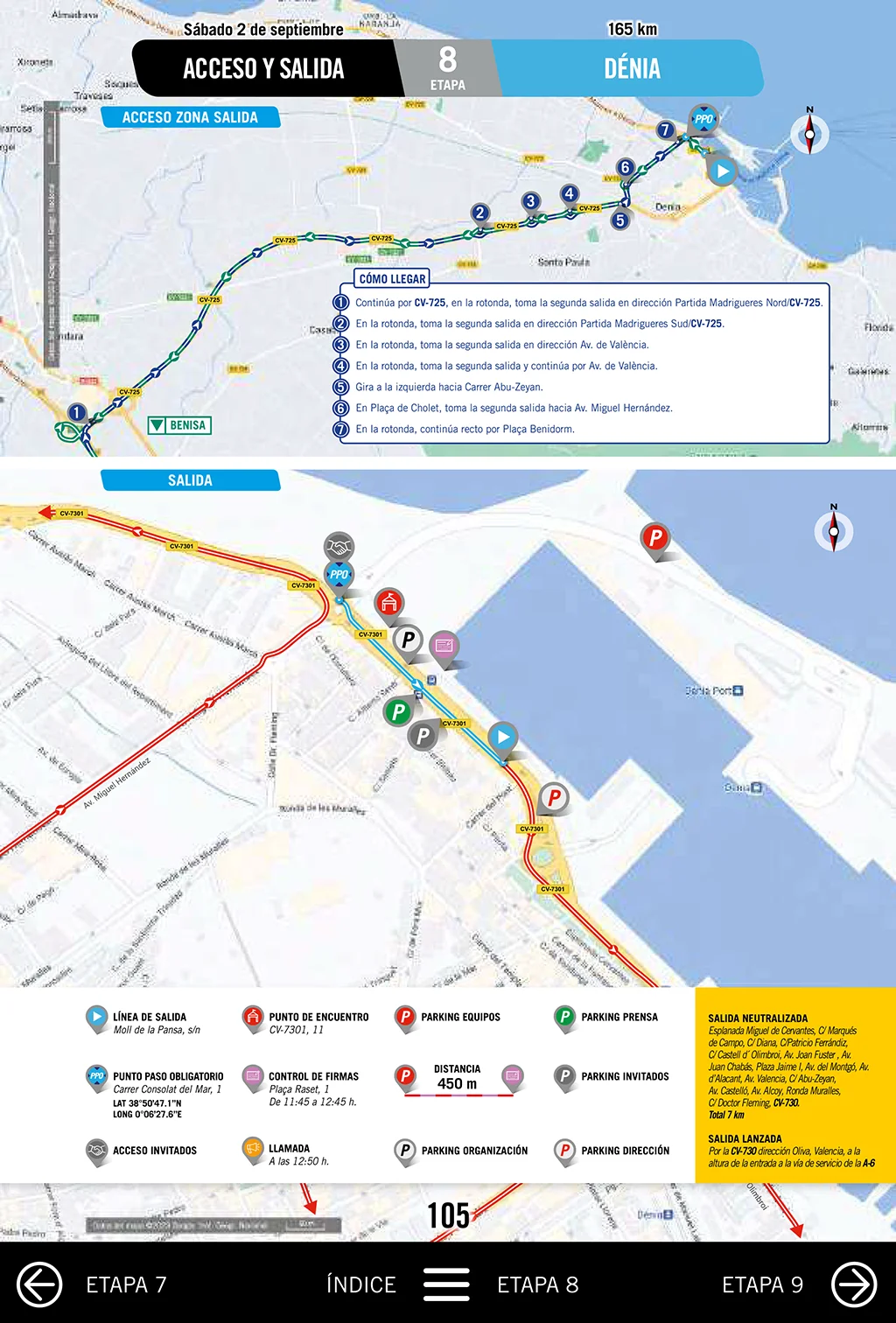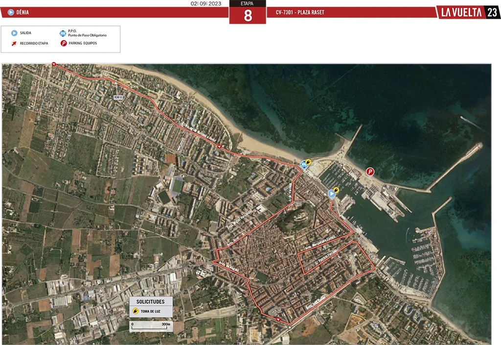 Der Stadtrat erklärte, dass der Verkehr im Stadtzentrum von Dénia, wo die Radfahrer fahren werden, ab ca. 12.15 Uhr gesperrt sein wird. Der Start der neutralisierten (nicht wettbewerbsfähigen) Strecke ist für 12.55 Uhr vorgesehen und erfolgt in der Calle Bellavista, neben der Promenade Miguel Cervantes. Die Strecke führt über die Straßen Marqués de Campo, Diana, Patricio Ferrándiz, Castell de Olimbroi, die Avenida Joan Fuster und Juan Chabás, den Platz Jaume I, die Avenida Montgó, Alicante und Valencia, die Avenida Abu Zeyan, die Avenida Castellón und Alcoy, die Ronda de las Murallas, die Avenida Dr. Doctor Fleming, den Platz Benidorm und die Avenida Consolat del Mar, wo die Strecke das Stadtzentrum verlässt. Die Vorhersage sieht vor, dass der Start der Strecke, das eigentliche Rennen des Wettbewerbs, um 13.10 Uhr auf der Höhe des Strandgebiets von Bassetes erfolgt und über die Straße zu den Marinas (CV730) in Richtung Oliva durch Els Poblets führt. Die Entfernung zwischen dem neutralisierten Start und dem Start des Rennens beträgt 7 Kilometer.
