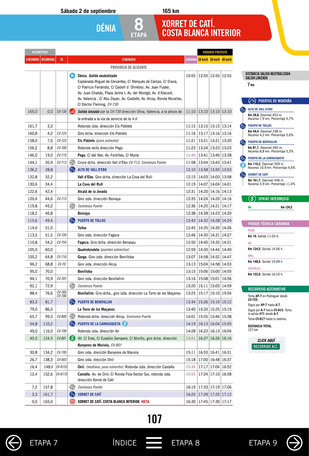 Weitere Gemeinden in Alicante, durch die die Vuelta am 2. September führt, sind neben Dénia, Els Poblets, Pego, Tollos, Fageca, Quatretondeta, Gorga, Benilloba, Benifallim, La Torre de les Maçanes, Ibi und Onil. Der Tag umfasst auch drei Pässe der zweiten Kategorie – Alto de la Vall d’Ebo, Puerto de Benifallim und La Carrasqueta – und einen Pass der dritten Kategorie – Tollos.