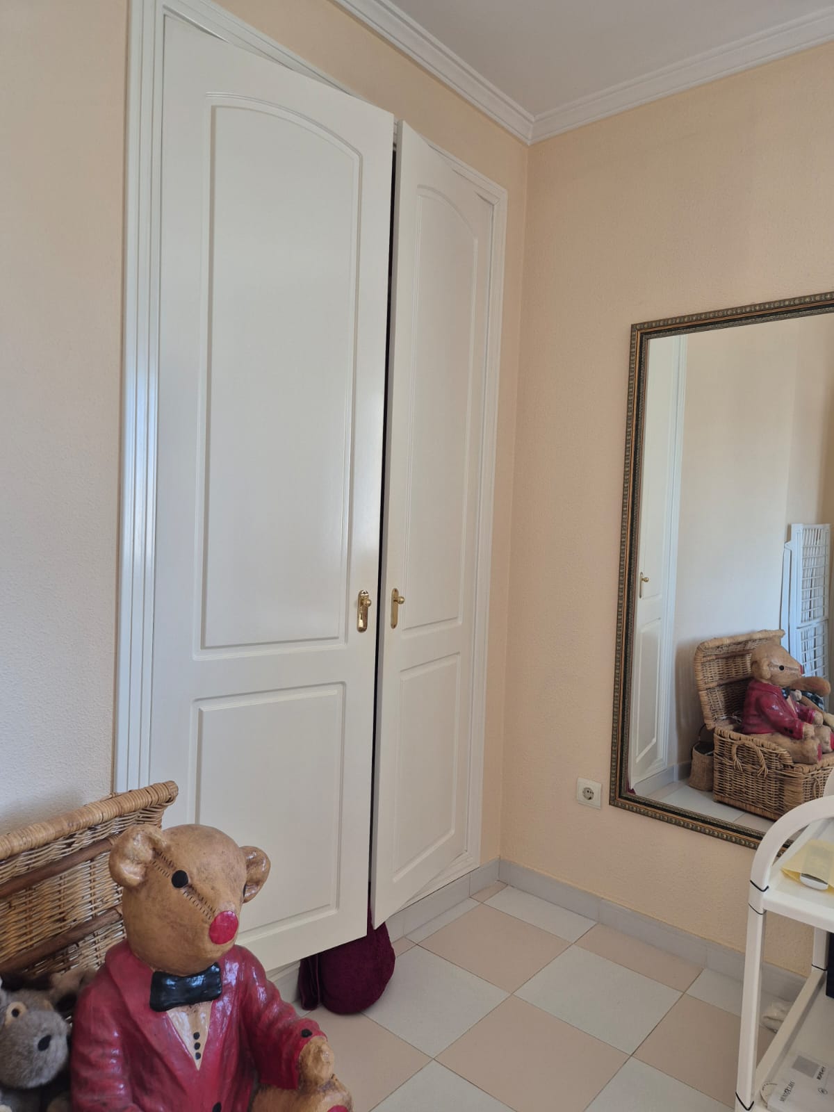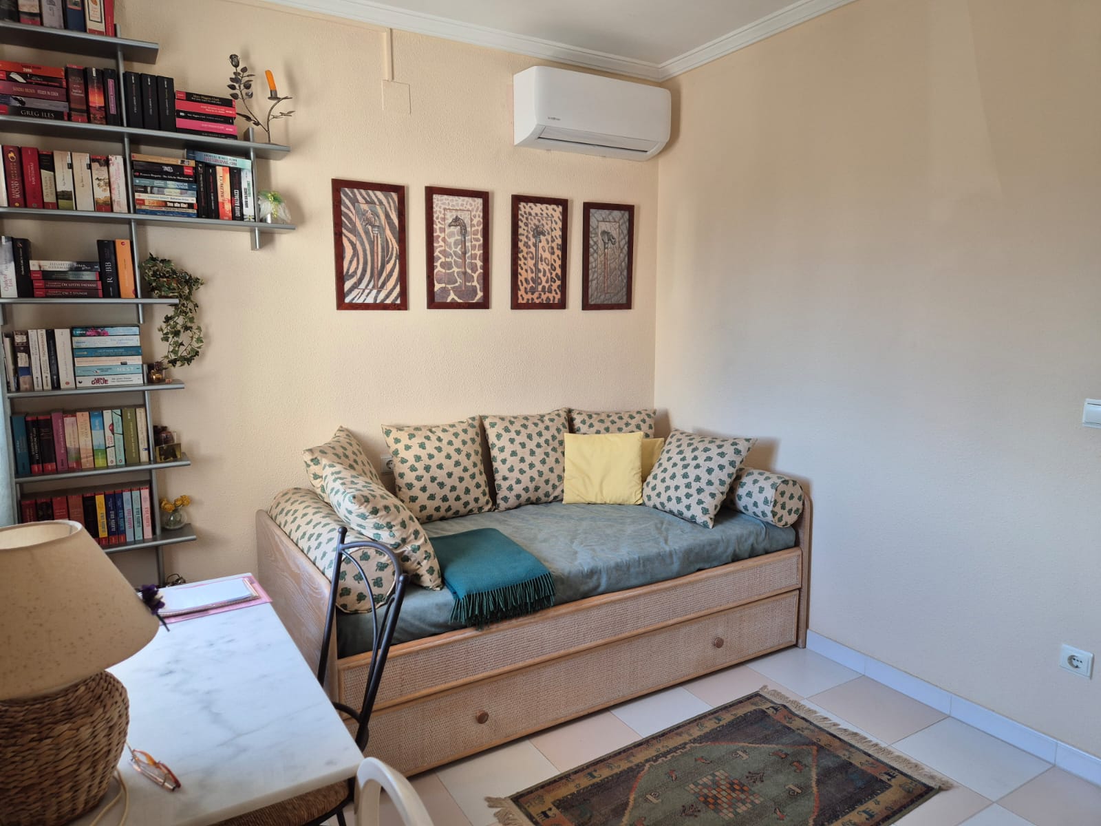 To access the house you have to go up some stairs, equivalent to a ‘mezzanine’ floor. The duplex has air conditioning hot/cold throughout the house. On entering we find the living/dining room with open plan kitchen, which is fully equipped. The cosy living/dining room with access to the spacious terrace. Next to the kitchen is the utility room with sink, washing machine and water heater. On this ground floor there is a guest toilet.