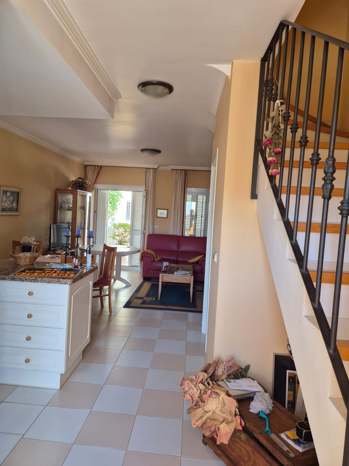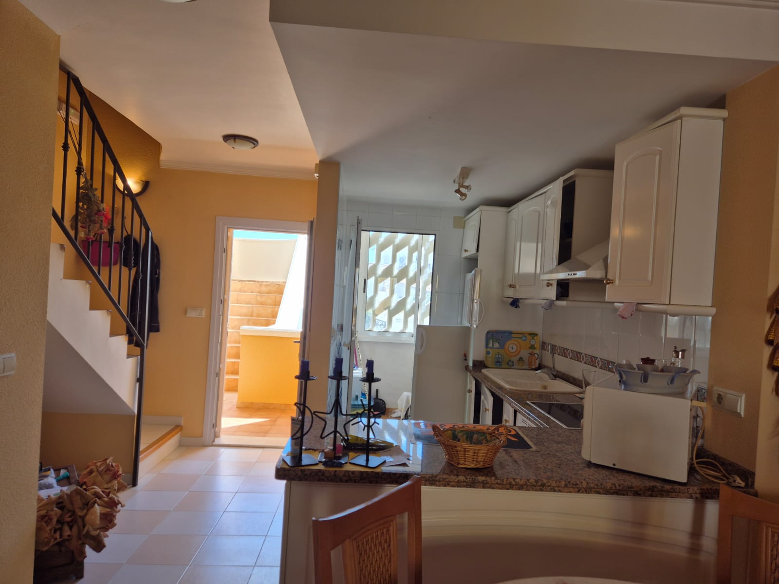 Para acceder a la casa hay que subir unas escaleras, equivaldria a una planta „entresuelo“. El dúplex dispone de aire acondicionado frio/calor en toda la casa. Al entrar nos encontramos el salón/comedor con cocina americana, esta está completamente equipada. El acogedor salón/comedor con acceso a la amplia terraza. Junto a la cocina se encuentra la galeria con lavabo, la vavadora y calentador de agua. En esta planta baja con aseo de cortesia.