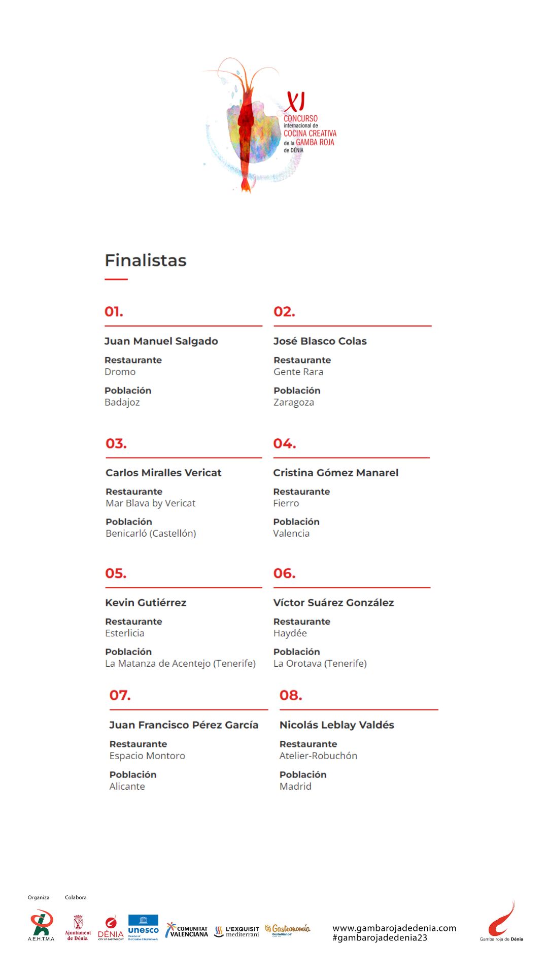 Diese acht Kandidaten werden im großen Finale am 28. Februar um die ersten drei Plätze der 11. Ausgabe des Wettbewerbs der Roten Garnele von Dénia kämpfen. Die Hauptstadt der Marina Alta verspricht an diesem Tag ein gastronomisches Fest zu werden, bei dem Teilnehmer, Fachleute und Kochbegeisterte zusammenkommen, um den Finalisten bei der Zubereitung ihres ausgewählten Rezepts live zuzusehen, wobei die rote Garnele aus Dénia die Hauptzutat ist. Diese Hauptzutat des Wettbewerbs wird mit freundlicher Genehmigung der Fischerzunft von Dénia jedem der Teilnehmer für die Zubereitung von elf Portionen ihrer Gerichte zur Verfügung gestellt, die sie der Jury präsentieren müssen.