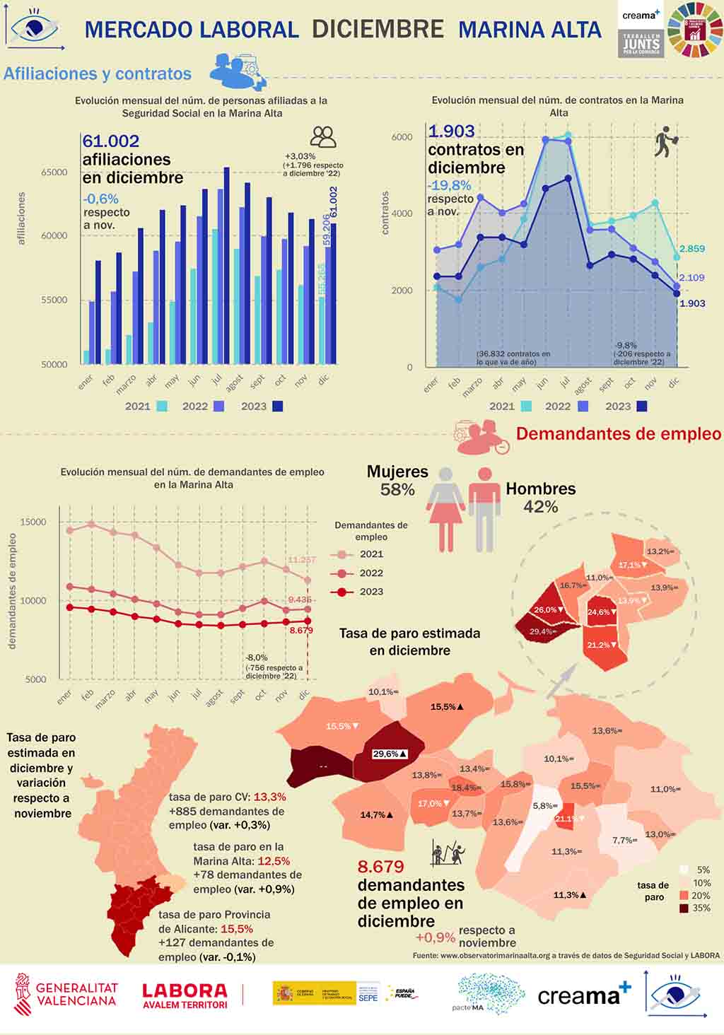 Gestern analysierte die Creama-Beobachtungsstelle die Daten und hebt hervor, dass “die Zahlen für 2023 weiterhin die positiven Auswirkungen der letzten Arbeitsmarktreform und die Widerstandsfähigkeit der Wirtschaft in der Marina Alta widerspiegeln”. Dies wird durch die Zahl der im Laufe des Jahres geschaffenen Arbeitsplätze bestätigt, “trotz Inflation und geopolitischer Spannungen”. Das Jahr 2023 war auch das dritte Jahr in Folge, in dem die Beschäftigung nach den starken Auswirkungen der Pandemie auf den Arbeitsmarkt gestiegen ist. In der Tat hat die Wirtschaft der Marina Alta jetzt 7.298 Beschäftigte mehr als im Dezember 2019, davon fast 60 % der neuen Arbeitsplätze sind unbefristete Verträge.