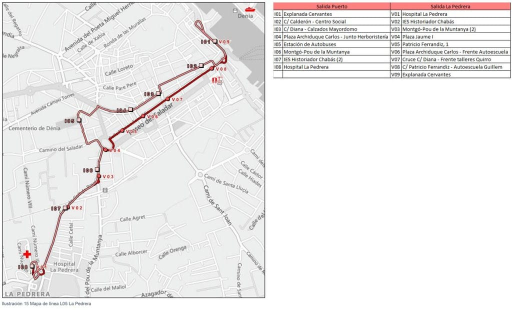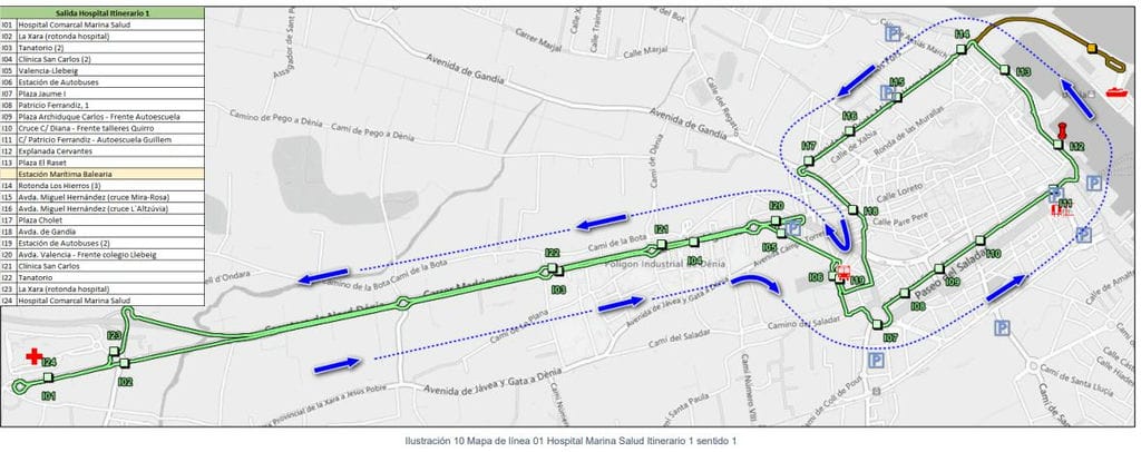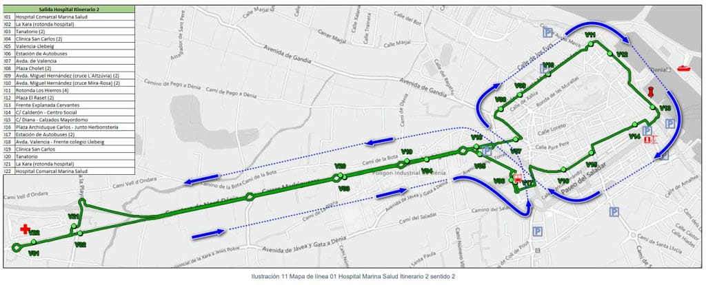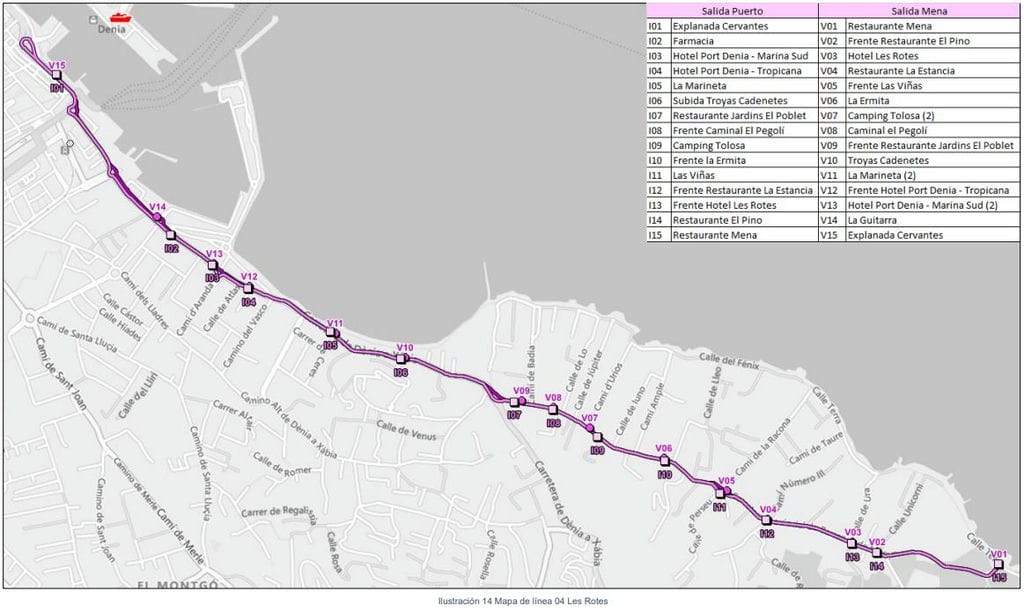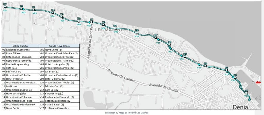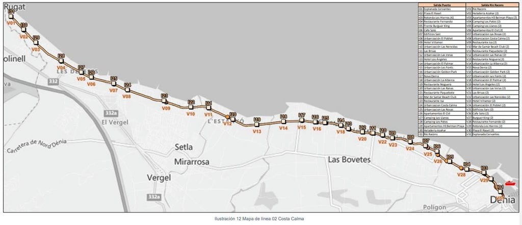 Das Projekt sieht fünf Linien vor. Drei davon werden mit einem 22-sitzigen Kleinbus betrieben. Linie 1 (Krankenhaus und Rundweg durch das Stadtzentrum), Linie 4 (Cervantes Esplanade – Marineta Cassiana – Ende von Les Rotes) und Linie 5 (von Cervantes Esplanade zum Krankenhaus La Pedrera). Die anderen beiden, mit dem Bus: 2 (Costa Calma) und 3 (les Marines).