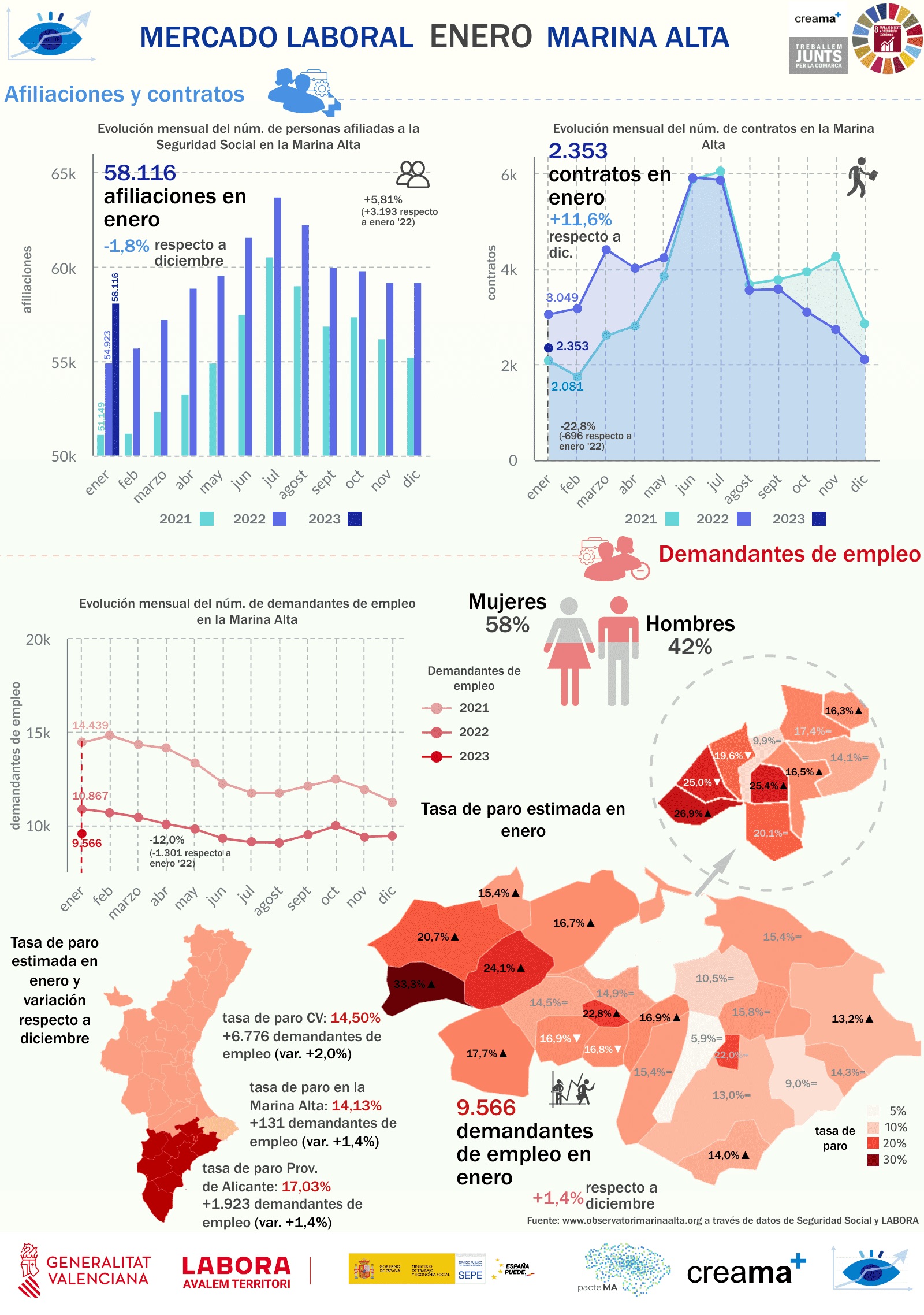 Die Arbeitslosenquote in der Marina Alta ist sie um einen halben Punkt gestiegen und erreicht eine geschätzte Arbeitslosenquote von 14,13 %. Auch die Provinz Alicante und die Comunitat Valenciana verzeichneten mit 17,03 % bzw. 14,50 % einen ähnlichen Anstieg ihrer Arbeitslosenquoten.