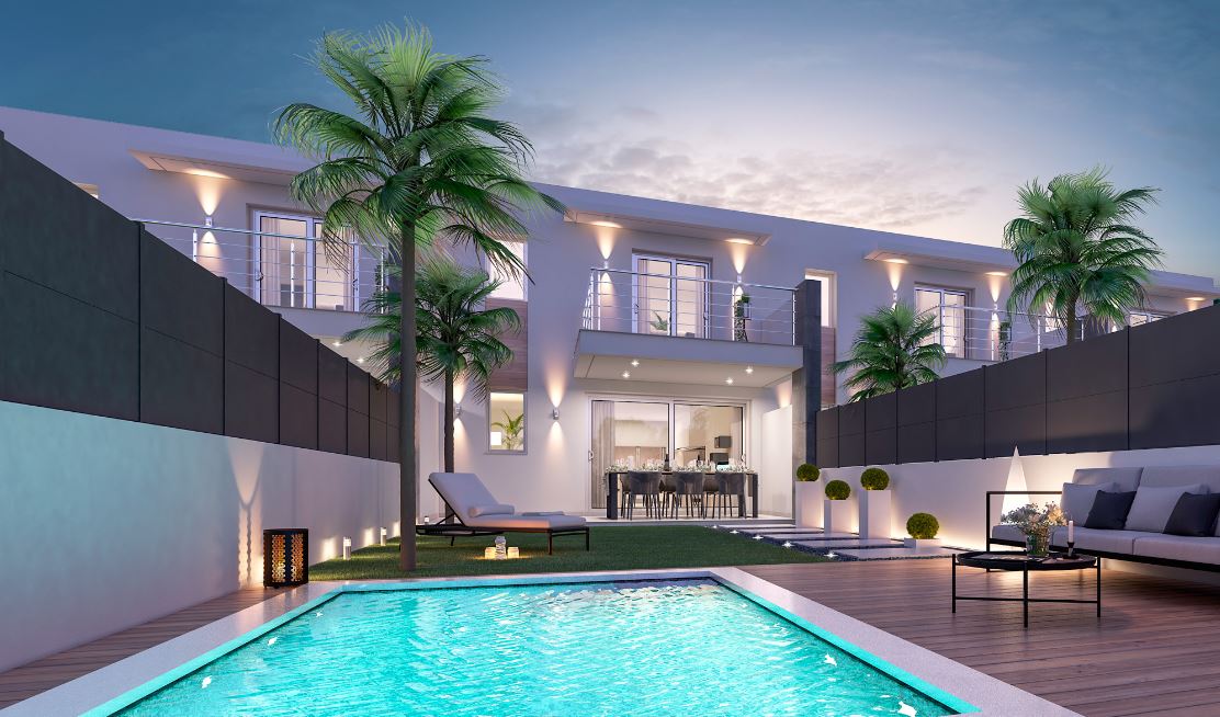 Neubauanlage von Stadthäusern neben dem Einkaufszentrum SEGARIA in El Vergel (Alicante). Es handelt sich um unabhängige Stadthäuser, jedes verfügt über einen eigenen vorderen Parkplatz und einen separaten Hintergarten mit eigenem Pool. Wasser und Lichtsteckdosen im Freien. Bereiche in einer überdachten sowie einer freien Terrasse.